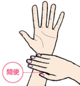 手の厥陰心包経(けついんしんぽうけい)という経絡のツボで、手のひら側の手首の横ジワの中央から上に指四本分上がったところです。そこに灸を5壮(そう)据えるとなっています。ここら辺の押して痛いところ、もしくは効く感じのするところを選ぶと良いと思います。