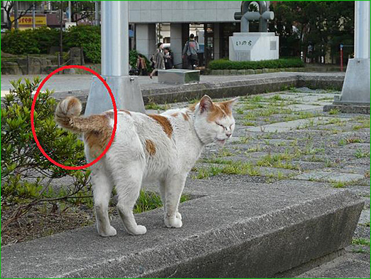 以前に、長崎のガイドブックに「長崎の猫の多くは尻尾が鍵状に曲がっている」と載っていたので、興味本位で猫を見かけるたびに確認してみました。恐らくガイドブックの内容は、長崎市内周辺のことと思いますが、五島もそうかもしれないと思い、観察してきました。結果は3匹見かけたうちの1匹が鍵状の尻尾でした。因みに上の写真はネットから拾ったもので、五島は関係ありません。